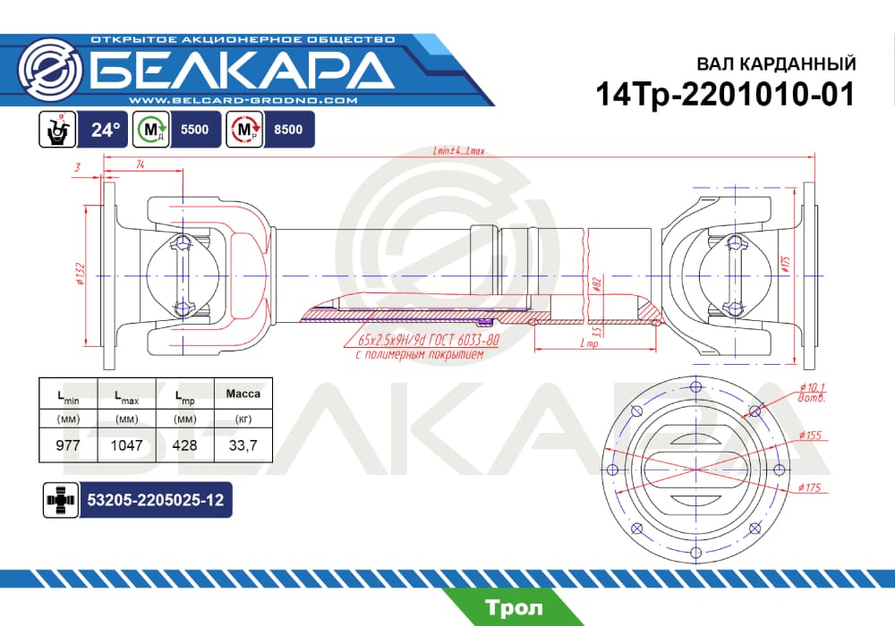 Применение: вал карданный троллейбусов Шкода-14Тр, -15Тр (Škoda 14Tr, 15Tr) и модификаций (эксплуатация троллейбусов на Украине, в странах Балтии, на Кавказе, в Европе)