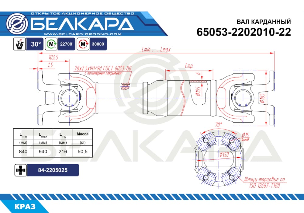 Применяемость:КрАЗ вал карданный служит для передачи крутящего момента до среднего моста автомобиля КрАЗ-64372, -6443, -644307, -64431, -65030, -65032, -65055 (взаимозаменяем с 65053-2202010-22)