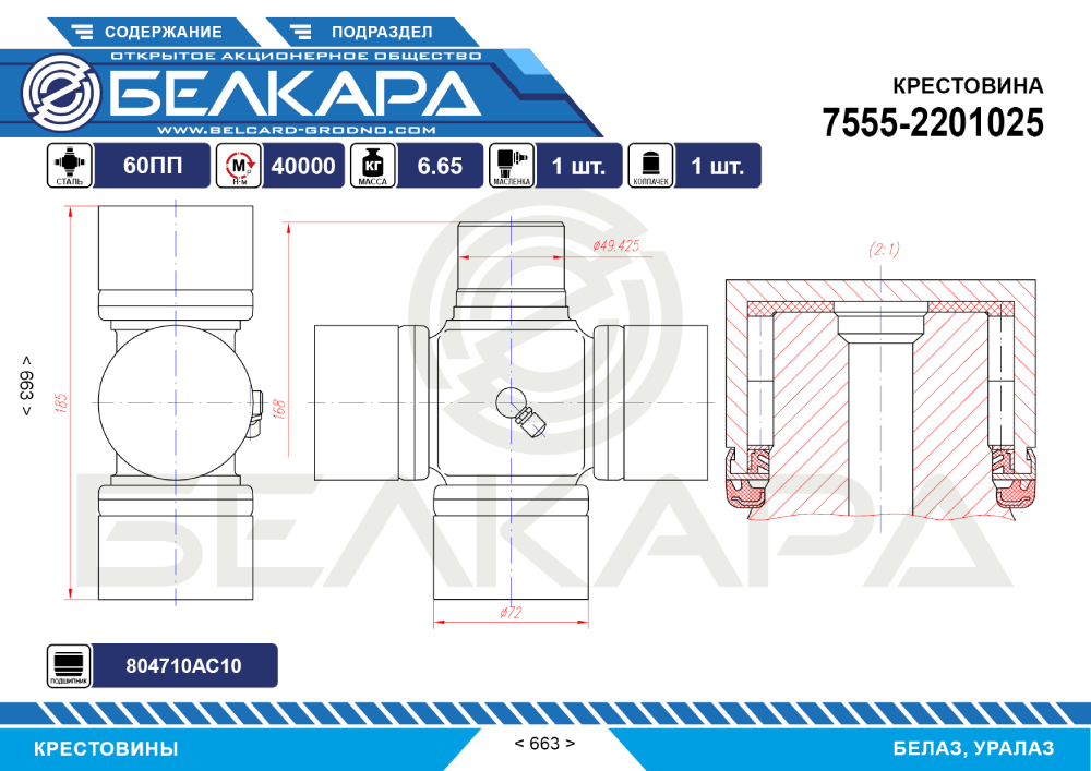 Вес Крестовина 7555-2201025 в сборе с подшипниками, не более — 6,65 кг.
