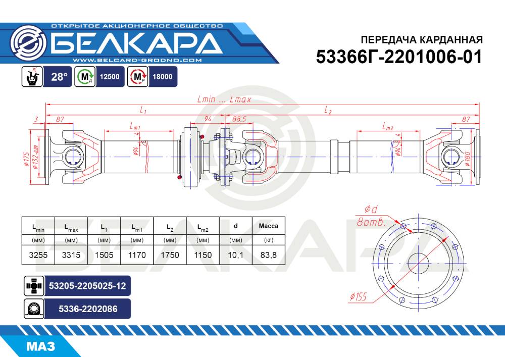 Применяемость:53366Г-220100601 передача карданная в сборе служит для передачи крутящего момента от коробки передач (ЯМЗ-236П) до заднего моста автомобиля МАЗ-533603, -53366, -5731, -63474 (взаимозаменяема с 53366220100601).