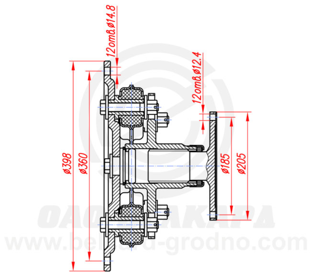 Присоед. размеры фланца, мм: 12 отв.D=12,4 на D=185 (к валу), 12 отв.D=14,8 на D=360 (к агрегату)